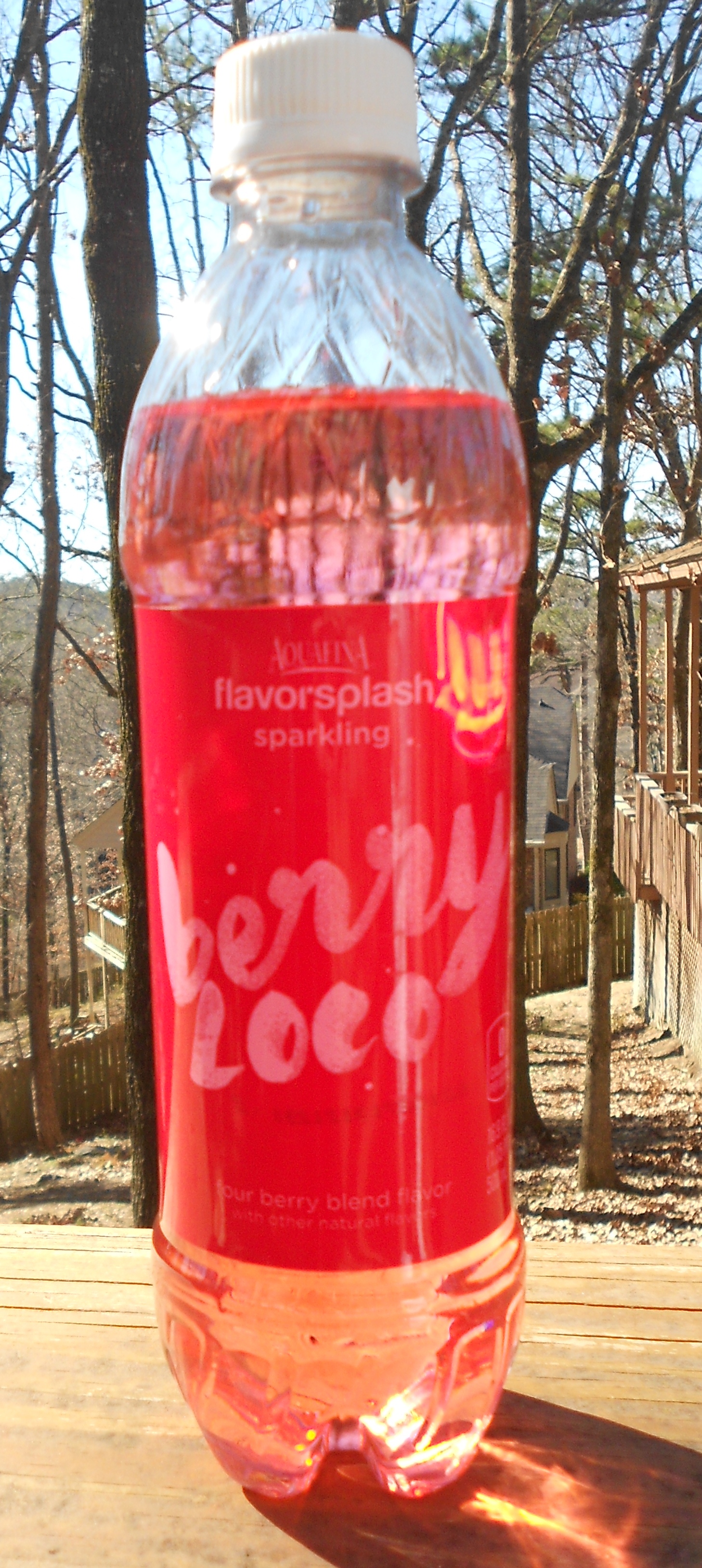 I’m having a hard time reading the label on this bottle of Aquafina Flavor Splash Sparkling Berry Loco Four Berry Blend Flavor, a product of Pepsico under its popular Aquafina bottled water brand.