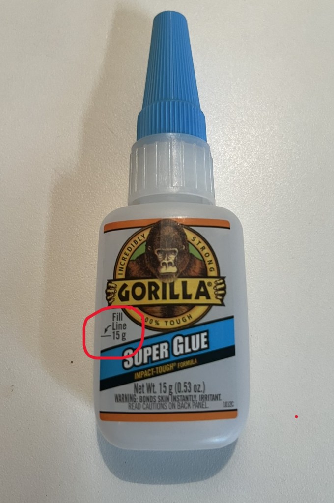 I bought this bottle of Gorilla brand Super Glue at Walmart. After unpackaging it and using a few drops, I noticed the bottle was half empty (or half full for the eternal optimists in the room). My first thought was that the product-to-packaging ratio was a merchandising ploy, but it’s not about marketing. It’s about physics. According to the Gorilla Glue Company official Facebook page, “We fill our super glue bottles by weight not by size so they may appear to be half full. Rest assured you have the full amount of glue you paid for. Look for the white fill lines on the cardboard package!” Gorilla Glue’s product information says, “for high performance and usability, the adhesive needs to be protected from air. One way to keep the air out of the adhesive is by packaging it in thick plastic bottles. If the thicker plastic bottle was completely full, it would be too hard to squeeze.”